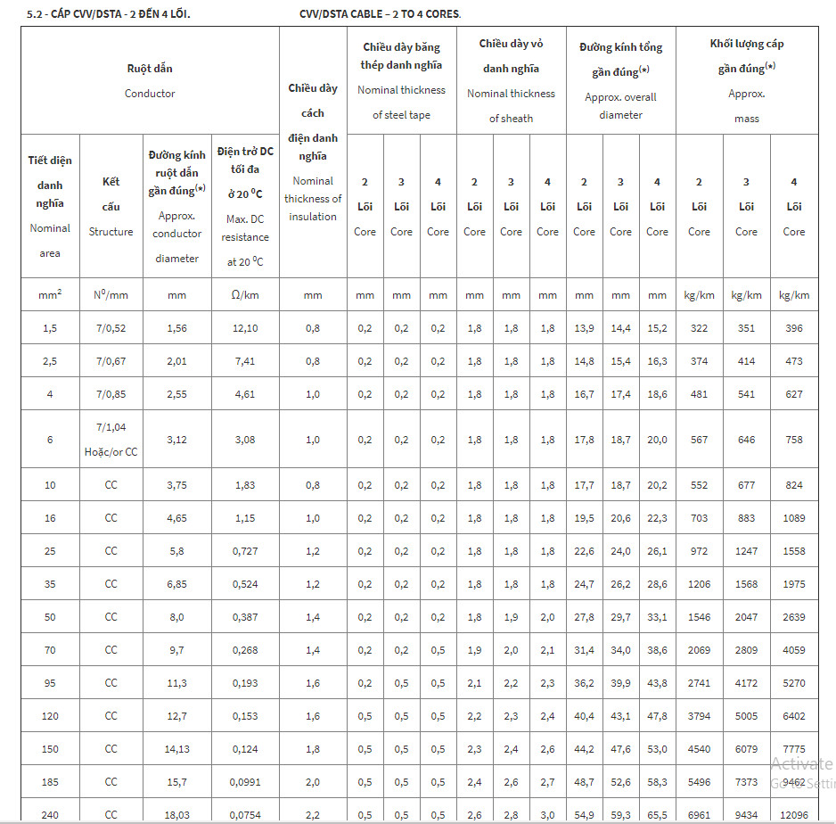 - Cấp điện áp U0/U: 0,6/1 kV.