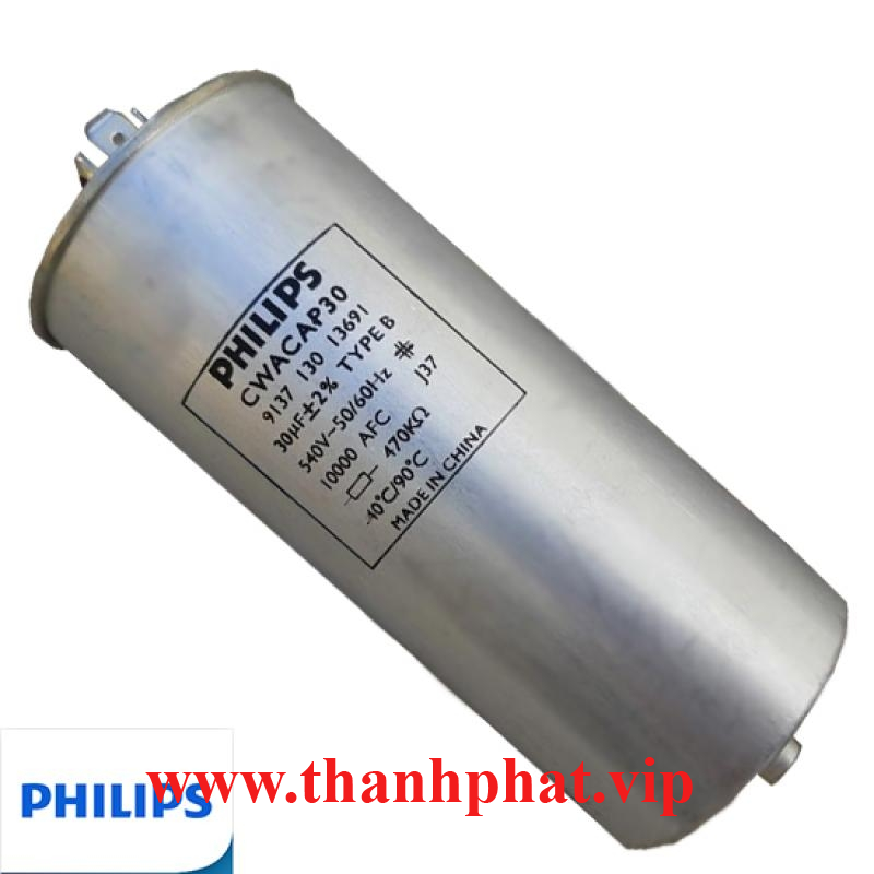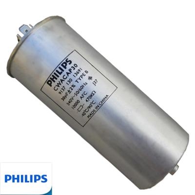Trong hệ thống đèn cao áp sử dụng Ballast điện từ. Tụ điện là một linh kiện quan trọng và cần thiết để giúp cải thiện hệ số công suất. Tụ điện của Philips có chất lượng cao được thiết kế làm việc ở tần số 50/60Hz giúp cải thiện hệ số công suất cosϕ >0.9. Ngoài ra, Tụ điện còn góp phần ổn định hoạt động của hệ thống, giúp bộ đèn hoạt động ổn định và an toàn hơn